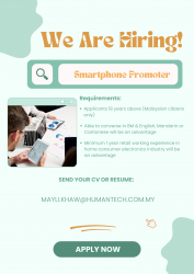 Email your CV or resume : mayli.khaw@humantech.com.my or WhatsApp to : 011-2064 0989Job Categories: Other. Job Types: Full-Time. Salaries: 1,000 - 2,000.